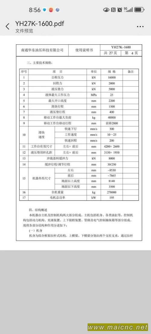 华东1600吨框架液压机台面2.6/4.6米.